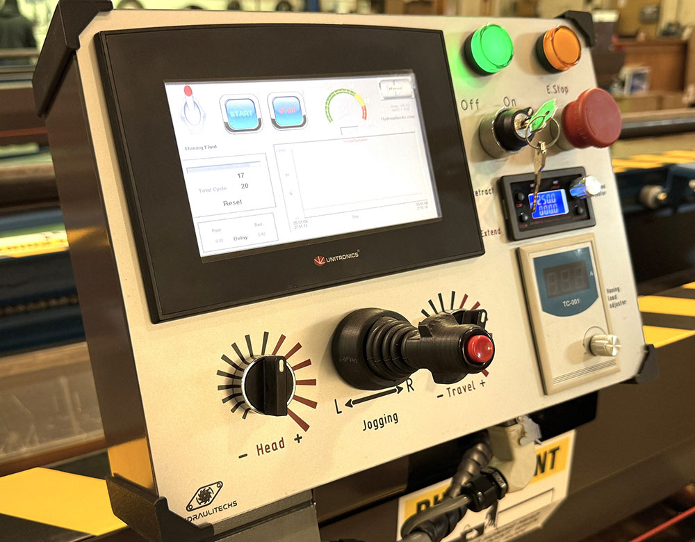 Load graph displays the load along the honing shaft during the strokes. This helps indicate locations of the tight bore spots.The manual stroker is available on the PLC to allow the operator to move the honing tool over the stroke length, to set the ends of the stroke during setup process.